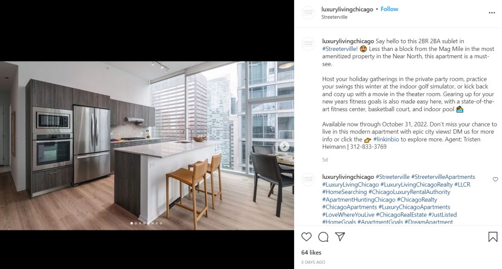 The post from Luxury Living Chicago below is an excellent example of a listing on Instagram. It includes plenty of high-quality photos and contains all the information a buyer needs: