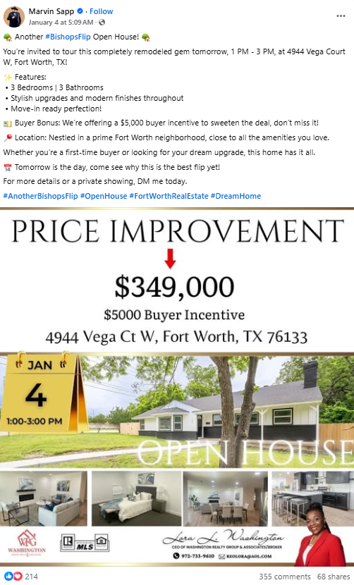 Here’s an example of a post by Marvin Sapp promoting an open house to prospective buyers: