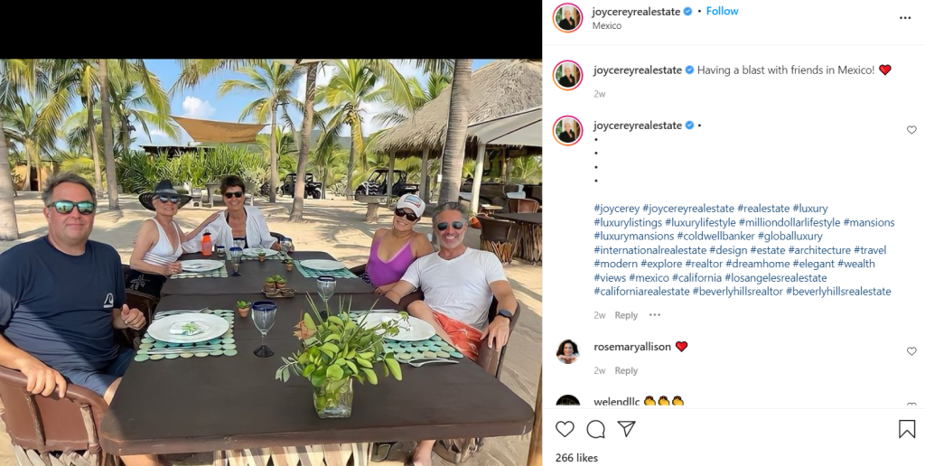 The post below from Joy Cerey is a good example. While the majority of her posts are of the luxury homes she sells in L.A., she adds in the occasional personal update: