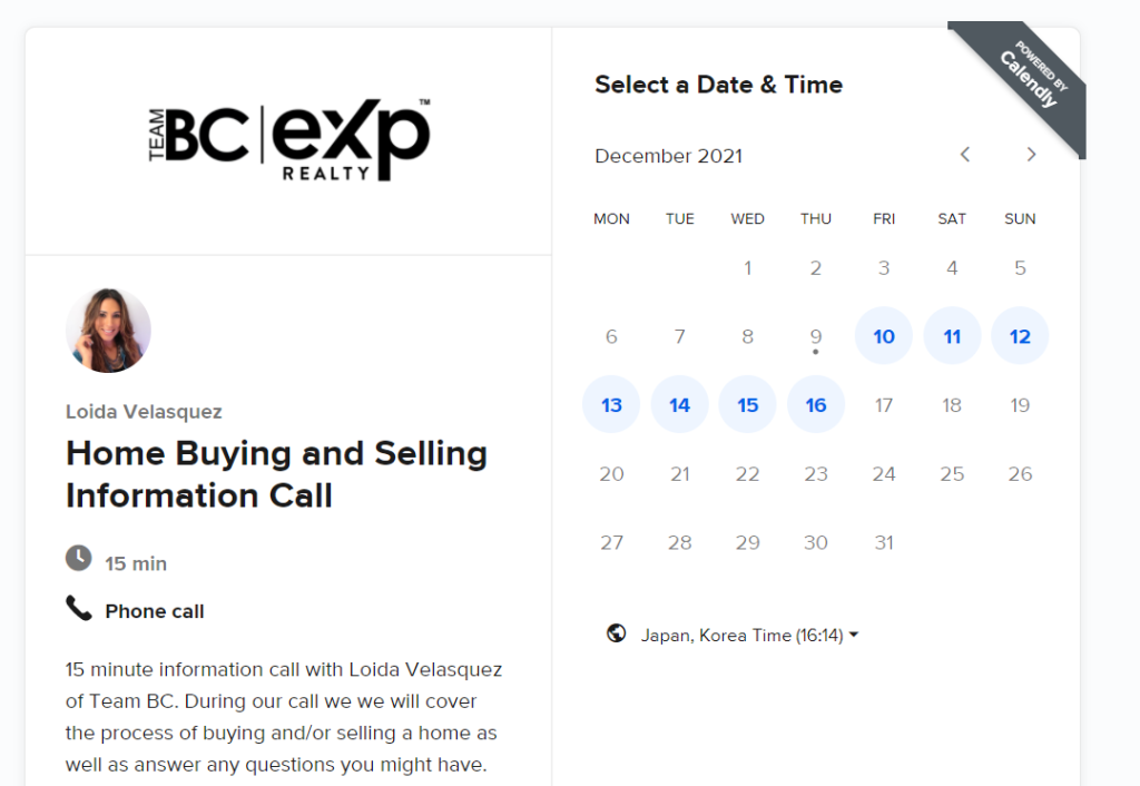 Here’s a great example from Loida Velasquez. She has specific pages for each link in her link tree. For example, if you click on “free buying or selling consultation,” you are directed to an easy-to-use calendar page that tells you exactly what to expect and lets you quickly book a meeting: