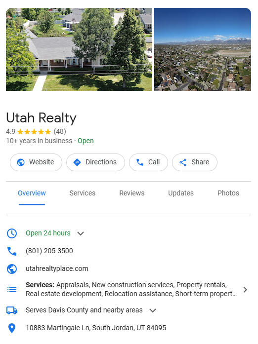 Below is an example of a great Google My Business profile from Utah Realty. It includes all their business information, including their service areas, website, location, and operating hours:
