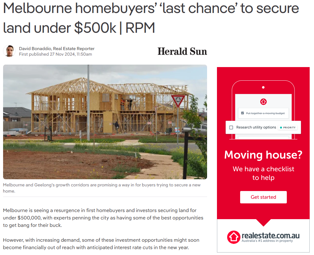 In the example below, the Herald Sun published a news article discussing affordable land opportunities in Melbourne. The article references RPM Real Estate and provides a link to its website:
