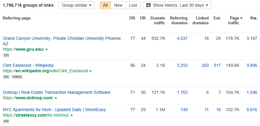 Here’s an example of how a backlink profile is displayed in Ahrefs: