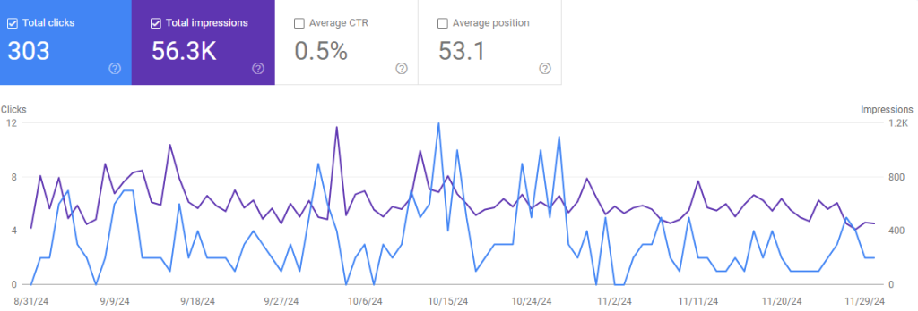 Here’s an example of how Google Search Console tracks these metrics, including clicks, impressions, CTR, and position:
