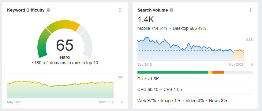- Evaluate keyword metrics: Ahrefs will provide data on metrics like search volume—which is how often a keyword is searched monthly—and keyword difficulty (KD)—which measures how competitive a keyword is to rank for. Look for keywords with a good balance of high monthly search volume, good user intent, and low competition to maximize your chances of success.