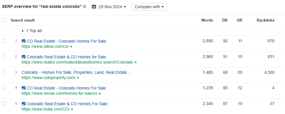 Below is the search volume and KD for “real estate Colorado.” As you can see, this could be a difficult keyword to rank for, but it has high search volume: