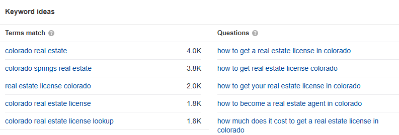 Here you can see the additional keywords and questions that Ahrefs has generated based on our keyword “real estate Colorado”: