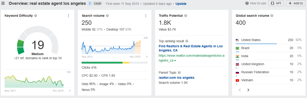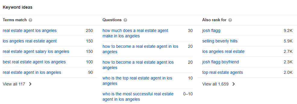 Here’s what the Ahrefs Keyword Explorer looks like for “real estate agent LA”: