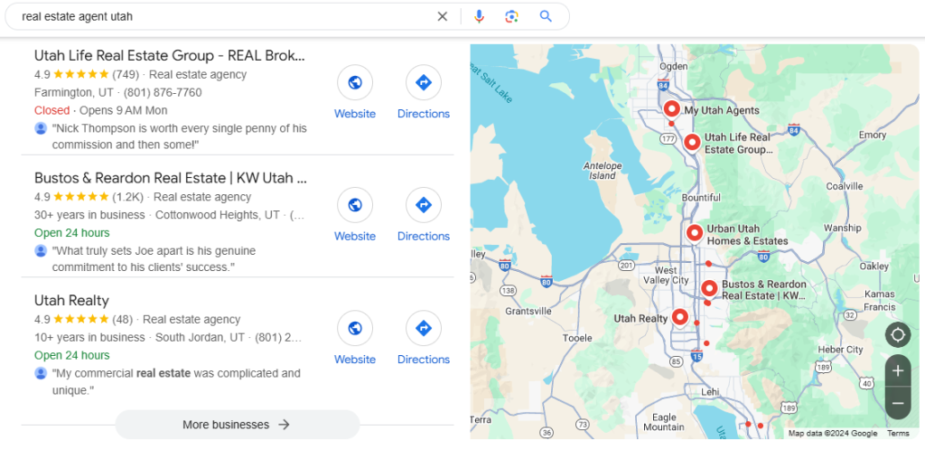 Here are the Google Business Profiles that show up when we search “real estate agent Utah”:
