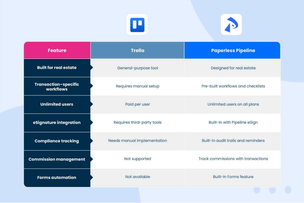 Below, we unpack the advantages and disadvantages of choosing Paperless Pipeline as an alternative to Trello for transaction management: