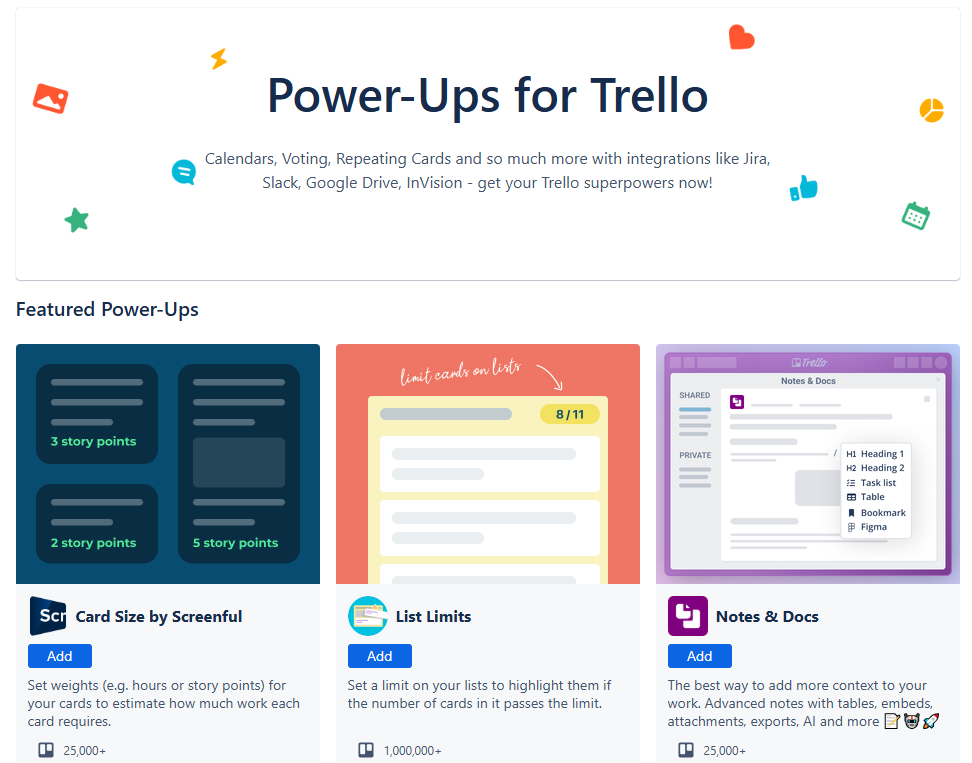 Trello’s “Power-Ups” system enables users to integrate the platform with a wide variety of third-party tools.