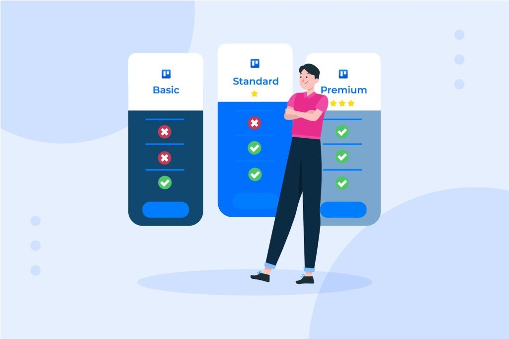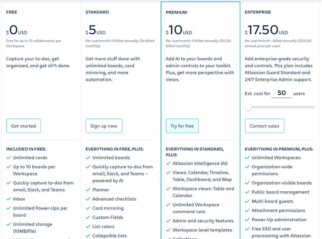 - The standard plan is $5 monthly per user and includes unlimited boards, card mirroring, and more automation features.