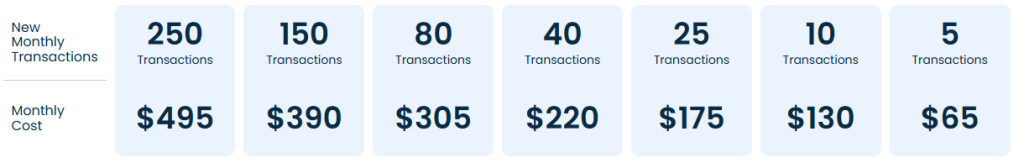 Pricing starts from as little as $65 per month for five transactions, $175 for 25 transactions, and ranges up to $495 for 250 transactions.